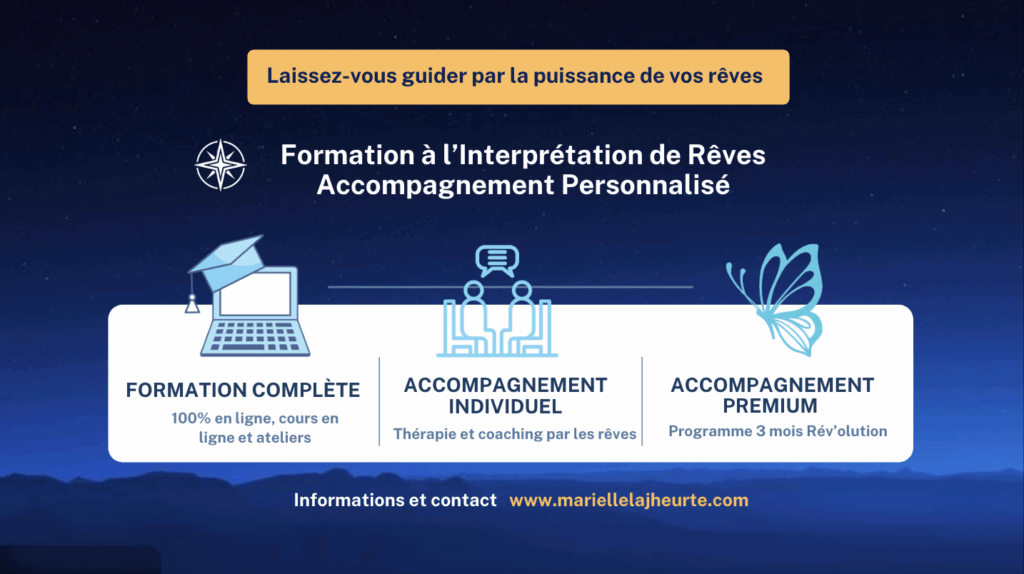 Si vous désirez comprendre vos rêves, contactez-moi pour une séance d’onirothérapie, ou apprenez l’interprétation des rêves avec l’école La Voie des Rêves..